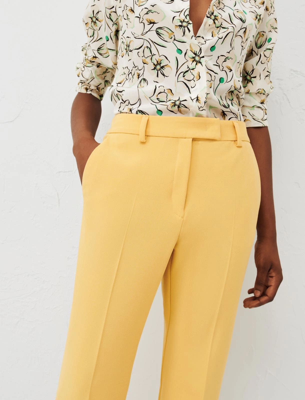 Брюки CHILD из эластичной парусины, расклешенный крой. Застежка на крючок и молнию. Косые передние карманы и прорезные задние карманы. Прессованные складки спереди и сзади.