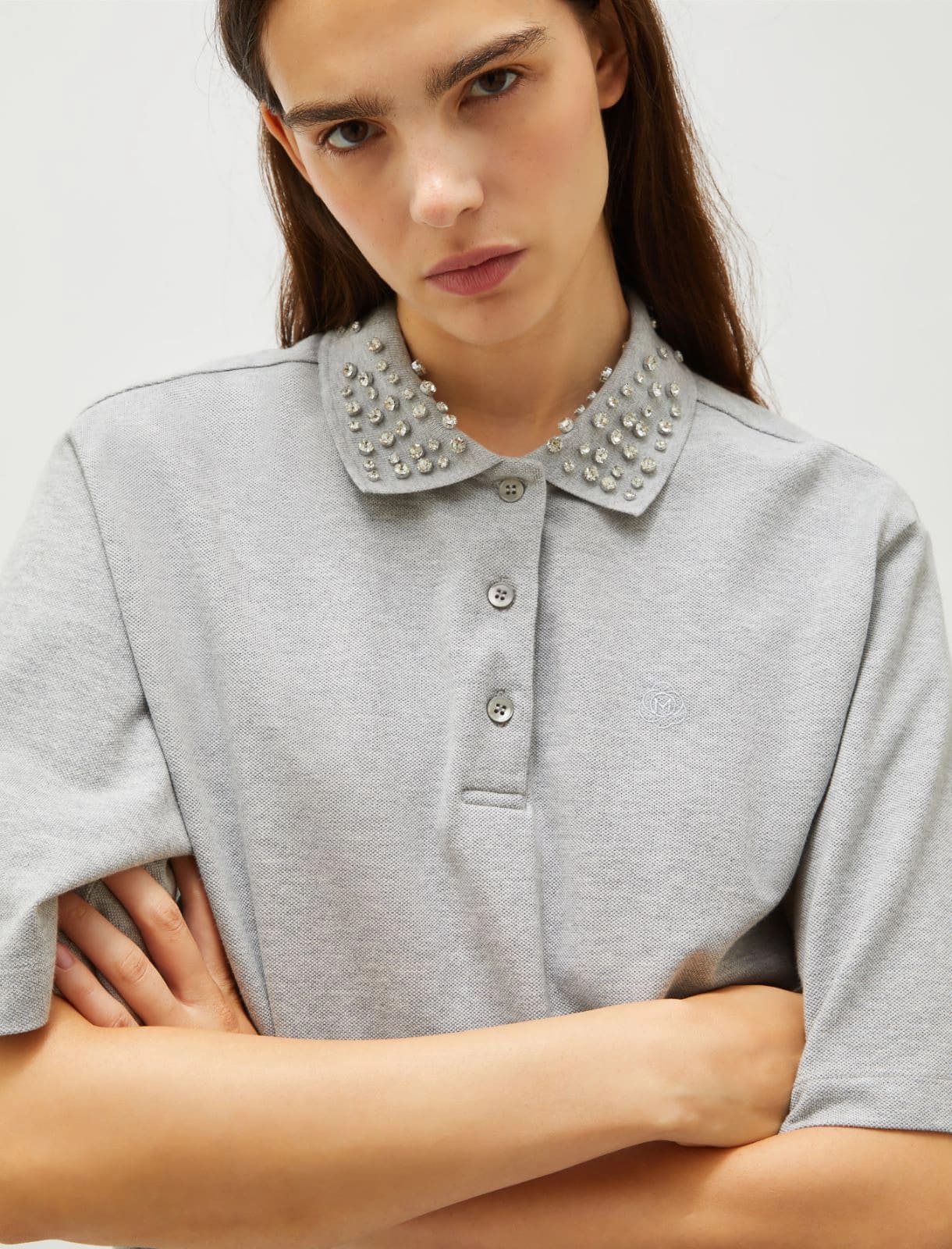 Футболка GONZAGA добавьте нотку гламура в свой повседневный образ с этим поло с короткими рукавами, украшенным кабошонными кристаллами на воротнике. В сочетании с юбкой миди, декорированной стразами, оно станет ключевой деталью для особых случаев. Поло из чистого хлопкового трикотажа пике. Прямой крой. Спущенные плечи. Вышитая деталь на груди.