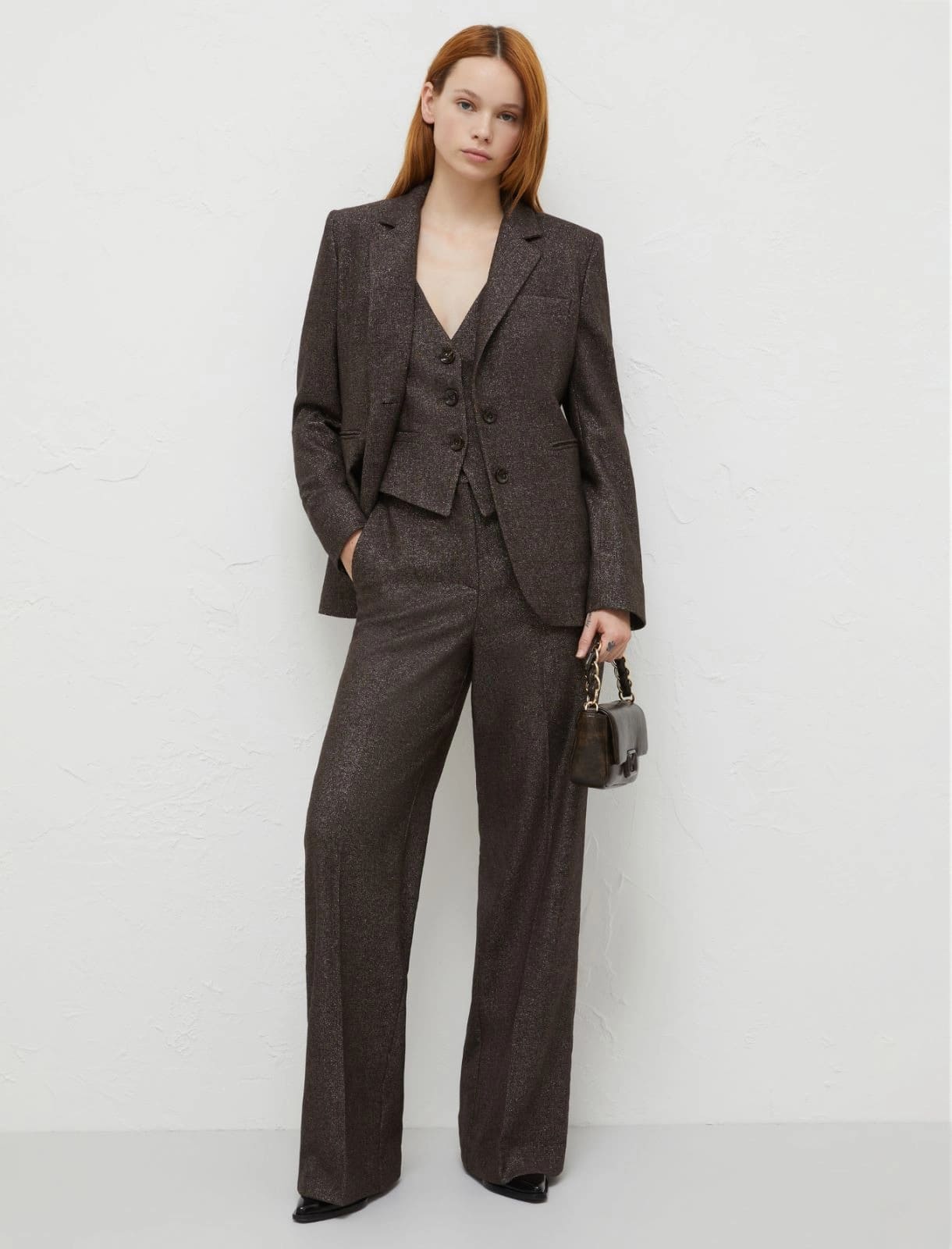 Жакет SEME из смеси шерсти и люрекса. Носите его в офисе и переосмыслите для вечеринки, просто поменяв аксессуары. Полуприталенный крой. Воротник-лацкан и длинные рукава. Однобортный, с видимой застежкой на пуговицы. Прорезные карманы. Модель на подкладе.
