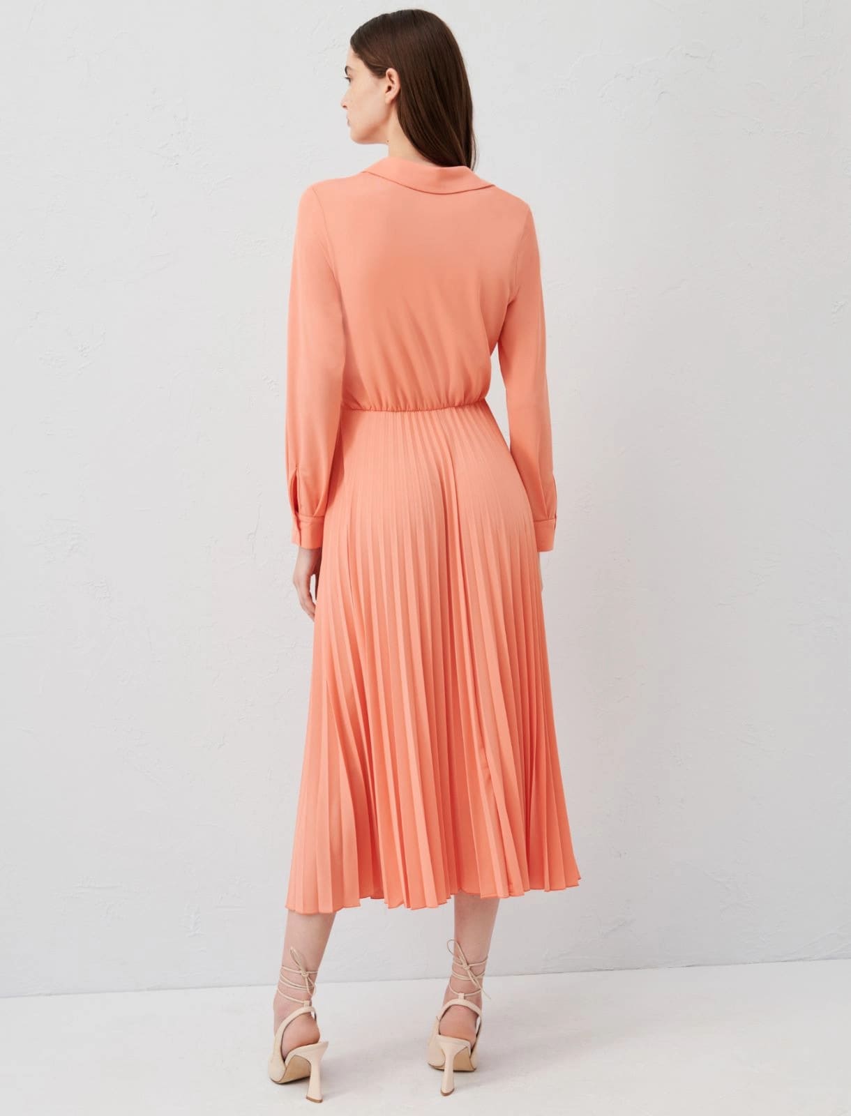Платье EVELIN миди из крепового джерси подчеркнут драпировкой. Юбка плиссирована и выделяется благодаря детали с эффектом драгоценного камня на талии. Прилегающий фасон с эластичной талией. Воротник рубашки с перекрещивающимся V-образным вырезом. Длинные рукава с манжетой. Модель без подкладки.