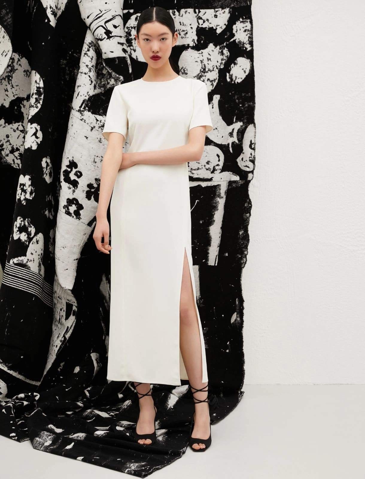 Платье PATTO минималистский крой, который идеально подходит для любого случая: это длинное платье скользит по силуэту и добавляет элегантности как дневным, так и вечерним нарядам. Платье является частью внесезонной капсулы Marella ART.365. Изготовлено из мягкой креп-сатиновой ткани, не требующей глажки. Полуприталенный крой с асимметричным разрезом спереди. Круглый вырез и короткие рукава. Потайная застежка-молния сзади. Модель без подкладки.