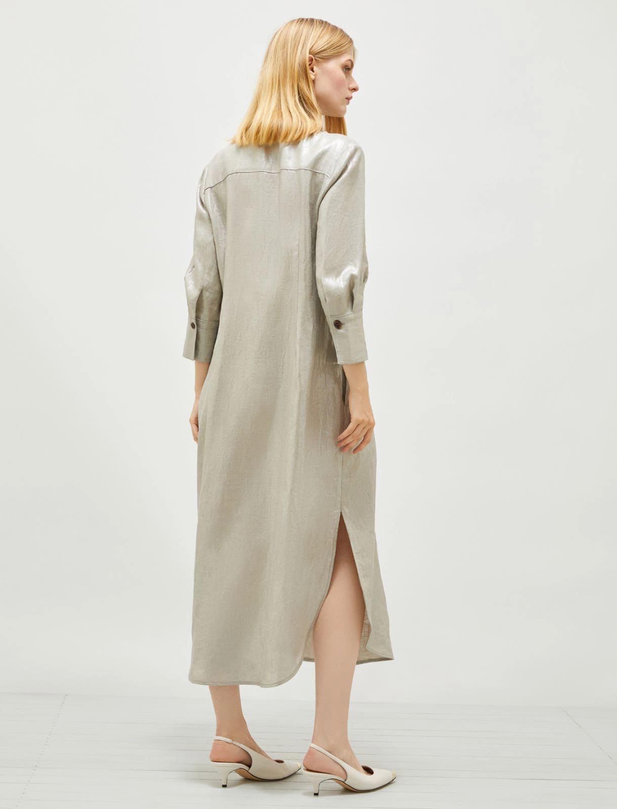 Платье TALPA новое платье-рубашка с городским настроением, с блестящим оттенком ламинированного льна для сезона, полного гламура. Затяните пояс на талии для четкого силуэта или используйте его как шарф для вашего собственного стиля. Прямой крой и расклешенный подол. Воротник рубашки и рукава 3/4. Видимая застежка на пуговицы. Тканевый пояс. Разрезной закругленный подол.