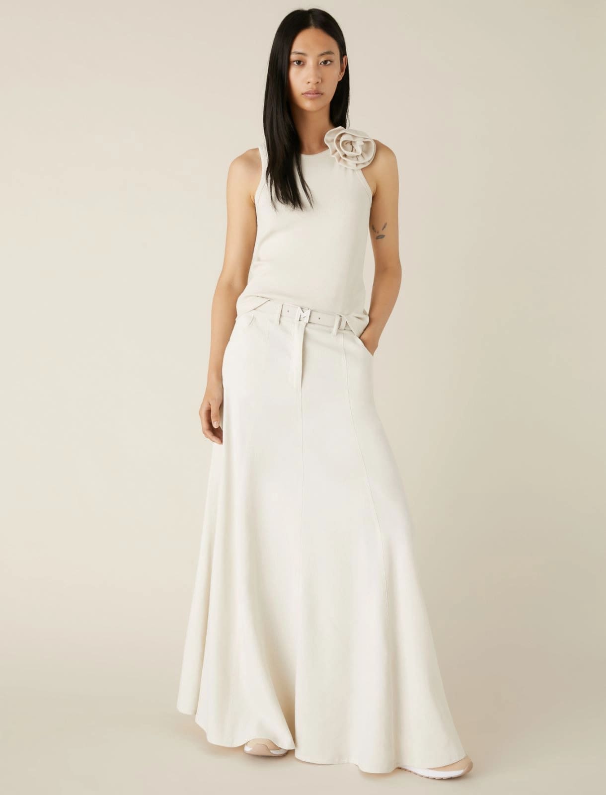 Юбка SELINA длинная юбка с пятью карманами: облегающий крой естественным образом подчеркивает изгибы тела, а расклешенная форма придает женственное очарование. Юбка из смесового льна стрейч. Потайная застежка на молнию и пуговицы. Вышитый логотип сзади.